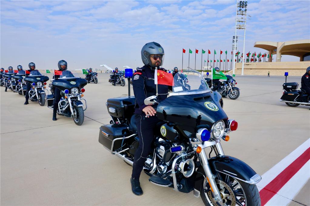 沙特王儲兼首相穆罕默德在下車(chē)處熱情迎接。兩國領(lǐng)導人步入檢閱亭,王宮軍樂(lè )團奏中沙兩國國歌。