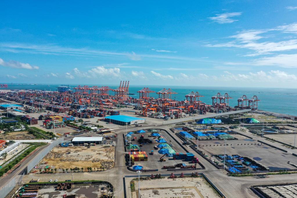 這是2022年8月27日拍攝的位于平陸運河出??诟浇谋辈繛掣蹥J州港區大欖坪作業(yè)區(無(wú)人機照片)。(新華社記者曹祎銘攝)