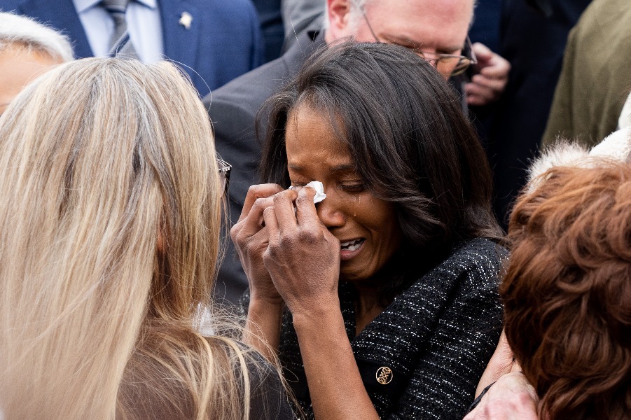 1月6日,在美國首都華盛頓的國會(huì )大廈外,一名前國會(huì )警察遺孀在紀念“國會(huì )山騷亂”兩周年紀念儀式上流淚。新華社記者劉杰 攝