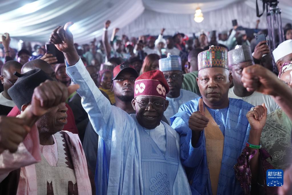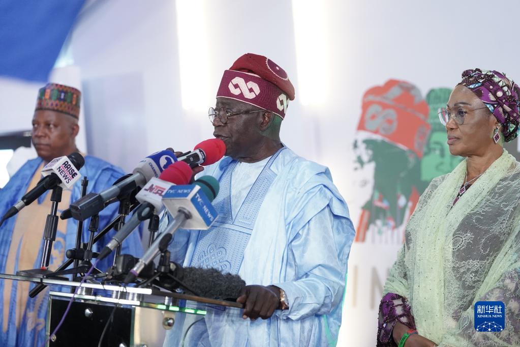 3月1日,在尼日利亞首都阿布賈,尼日利亞當選總統博拉·蒂努布(中)發(fā)表勝選講話(huà)。新華社發(fā)(埃馬·奧索蒂 攝)