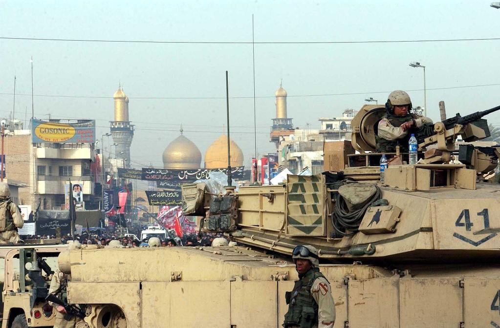 2004年3月2日,在伊拉克首都巴格達,駐伊美軍在通往卡茲米亞清真寺的路口警戒。當地時(shí)間2日上午10時(shí)左右,什葉派穆斯林圣地卡茲米亞清真寺相繼發(fā)生3起自殺式爆炸。新華社記者黃敬文攝