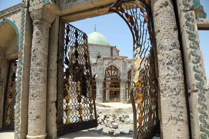 這是2022年7月3日在伊拉克摩蘇爾老城拍攝的努里清真寺大門(mén)。新華社發(fā)(哈利勒·達伍德攝)