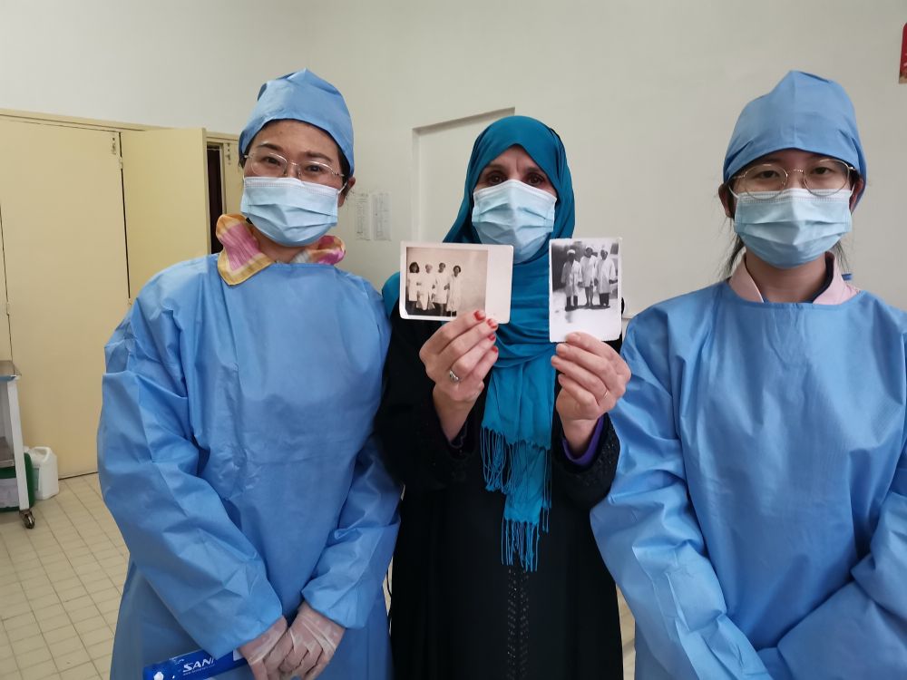 2021年11月14日,在阿爾及利亞阿爾及爾,中國援阿醫療隊醫生楊翊(左)接診的一名患者(中)展示1994年與中國醫生合影的老照片。新華社發(fā)(中國援阿爾及利亞醫療隊供圖)