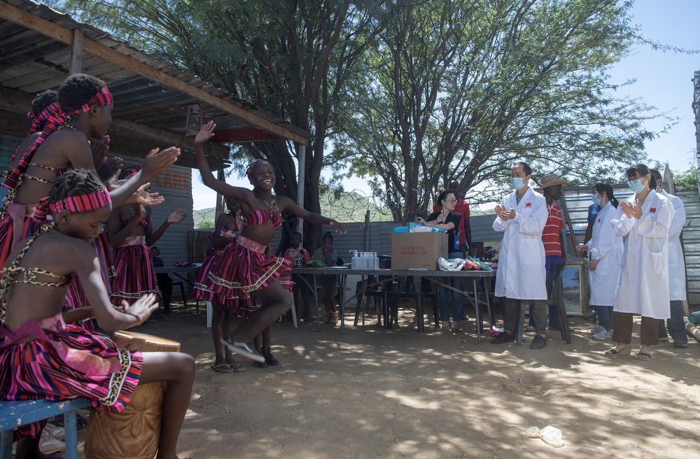2023年2月16日,中國第14批援納醫療隊來(lái)到距納米比亞首都溫得和克市中心約20公里的弗蘭斯藝術(shù)培訓中心,對在此學(xué)習的學(xué)生進(jìn)行健康檢查。這是藝術(shù)培訓中心的同學(xué)們用傳統舞蹈感謝中國醫生。新華社發(fā)(穆薩·卡薩克攝)