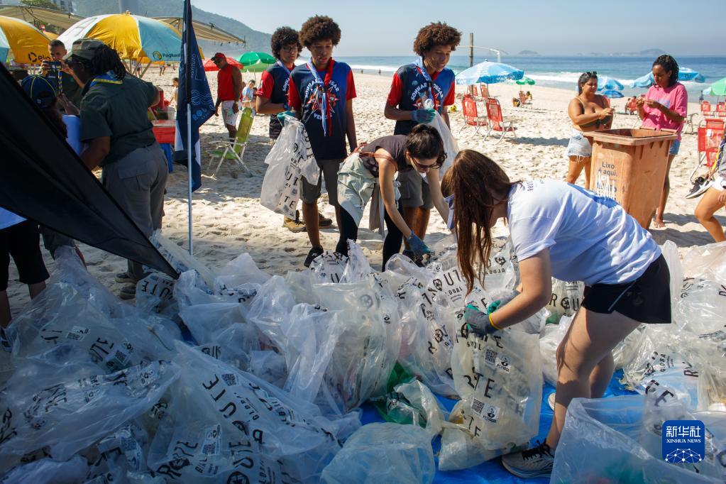 6月8日是世界海洋日。當日,志愿者們聚集在巴西里約熱內盧圣孔拉杜海灘,參與海灘垃圾清理行動(dòng)和保護海洋宣傳活動(dòng)。