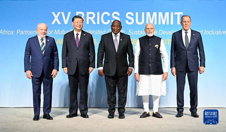 當地時(shí)間8月23日上午,金磚國家領(lǐng)導人第十五次會(huì )晤在約翰內斯堡杉藤會(huì )議中心舉行。南非總統拉馬福薩主持會(huì )晤。中國國家主席習近平、巴西總統盧拉、印度總理莫迪和俄羅斯總統普京(線(xiàn)上)出席。這是會(huì )晤期間,五國領(lǐng)導人集體合影。