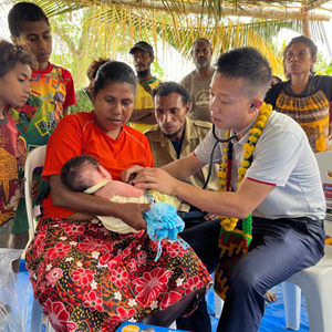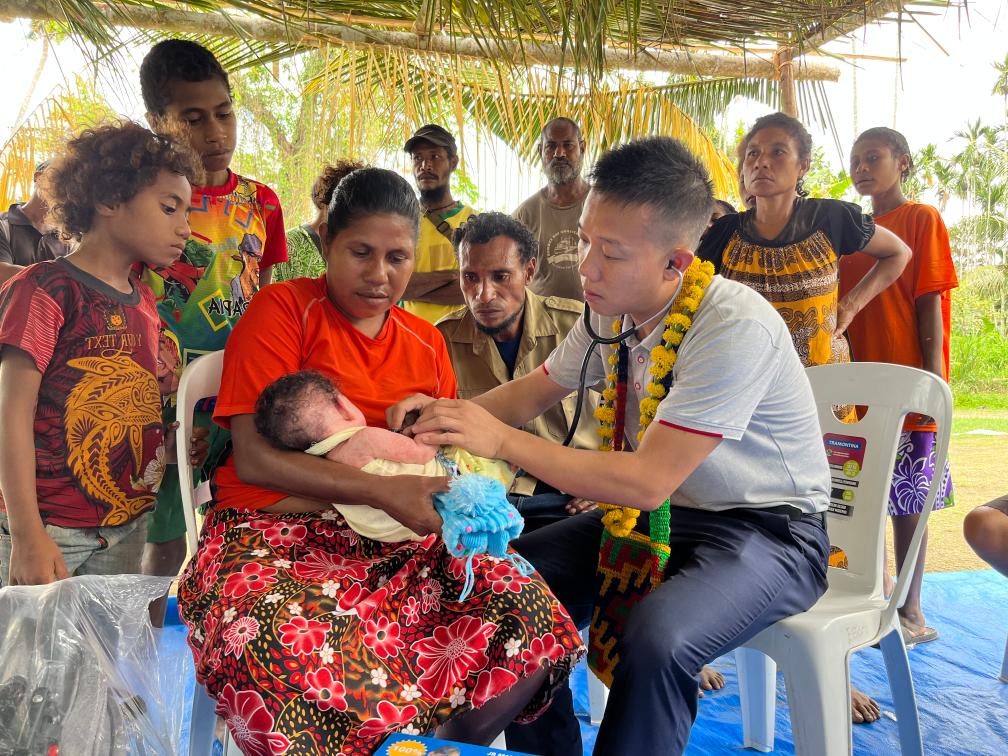 2023年8月5日,在巴布亞新幾內亞中央省的一個(gè)村莊里,第12批援巴新中國醫療隊副隊長(cháng)、新生兒科副主任醫師劉振球為當地嬰兒聽(tīng)診檢查。從2002年起,中國連續向巴新派出12批醫療隊,為提高巴新醫療衛生水平、促進(jìn)中巴新友好作出積極貢獻。新華社發(fā)(第12批援巴新中國醫療隊供圖)