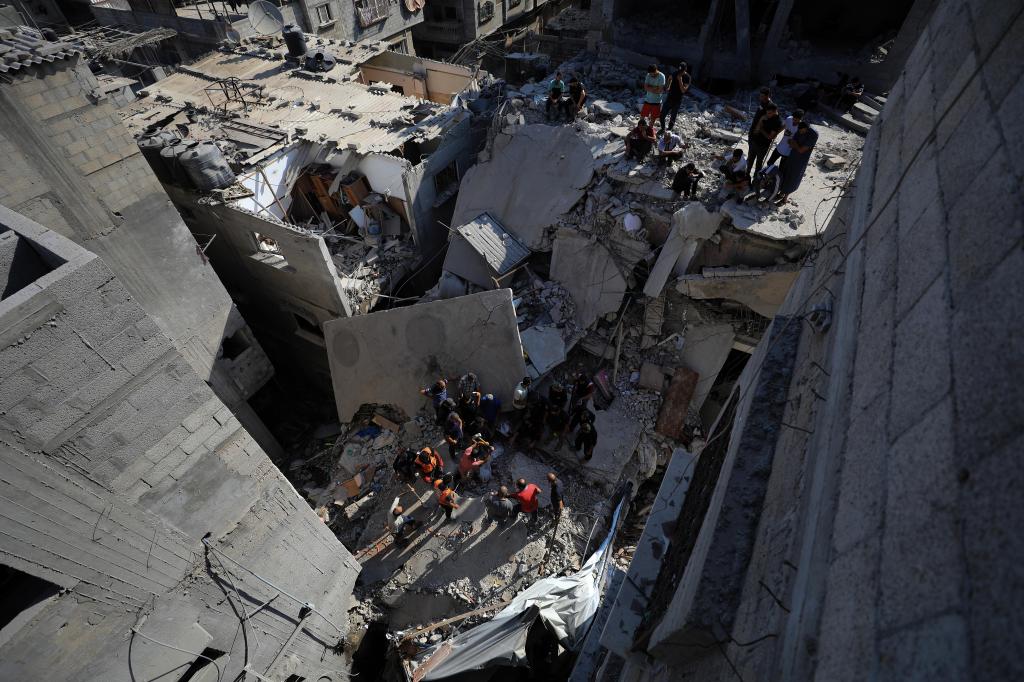 在加沙南部汗尤尼斯一個(gè)被夷為平地的街區,人們在廢墟中不斷挖掘。當11歲的西拉·哈姆丹被人們從破碎的水泥塊中抬出,她的身下還躺著(zhù)9歲的妹妹蒂拉。人們用花床單把兩個(gè)女孩裹起來(lái),送往太平間。