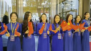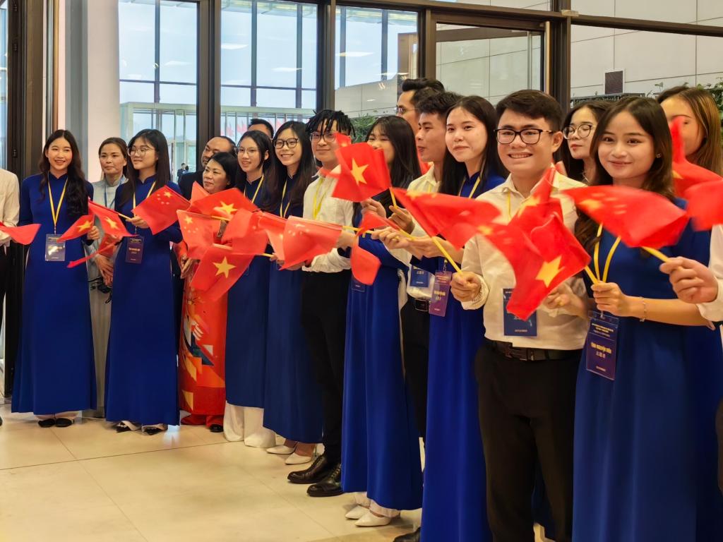習近平總書(shū)記和夫人彭麗媛抵達國家會(huì )議中心時(shí),受到越方青年代表熱烈歡迎。