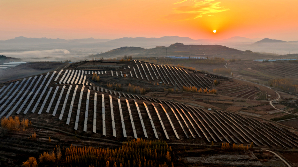 冬日時(shí)節,位于黃河“幾字彎”的內蒙古自治區巴彥淖爾市磴口縣寒意漸濃。記者從縣城出發(fā),沿著(zhù)穿沙公路行駛在烏蘭布和沙漠的茫茫沙海之中。不一會(huì )兒,就能看到車(chē)窗外連綿起伏的沙地上,整齊地排列著(zhù)藍色的光伏板,遠看好似沙海之中一片無(wú)邊無(wú)際的“藍?!?。